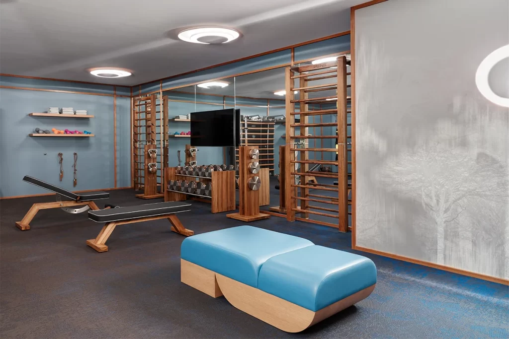 Furniture and lighting throughout were curated for harmony in scale and shape—Jean Royère, Joseph-André Motte, Alexandre Logé, and Wendell Castle all make appearances. Soft textures and muted tones define the primary suite, where a Pierre Frey suede wall, Minotti bed, India Mahdavi lamps, and a Pierre Paulin banquette create a restful composition.