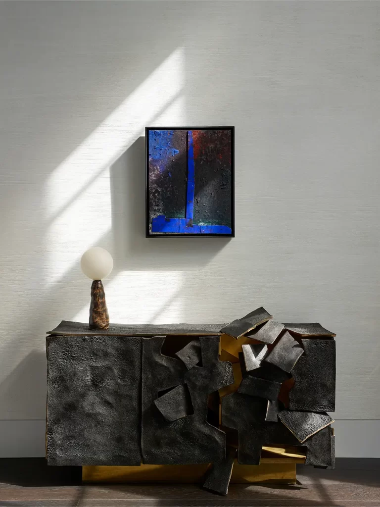In the living room, Christophe Delcourt sofas curve around India Mahdavi tables and Campana Brothers stools, while a Rashid Johnson painting crowns a limestone fireplace. The dining room features a Rick Owens table with vintage Pierre Jeanneret chairs and an Achille Salvagni chandelier paired with a starry Kiki Smith sculpture.