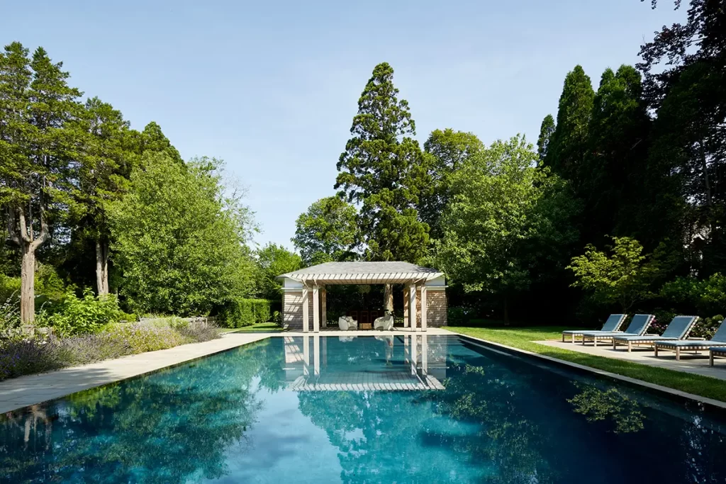Set on a tree-lined street in East Hampton, this 12,000 sq.ft. retreat was designed for a couple with three children and an extensive collection of contemporary art. The project brought together architect Thomas A. Kligerman, interior designer Francis D’Haene of D’Apostrophe Design, and landscape architect Edmund Hollander.
