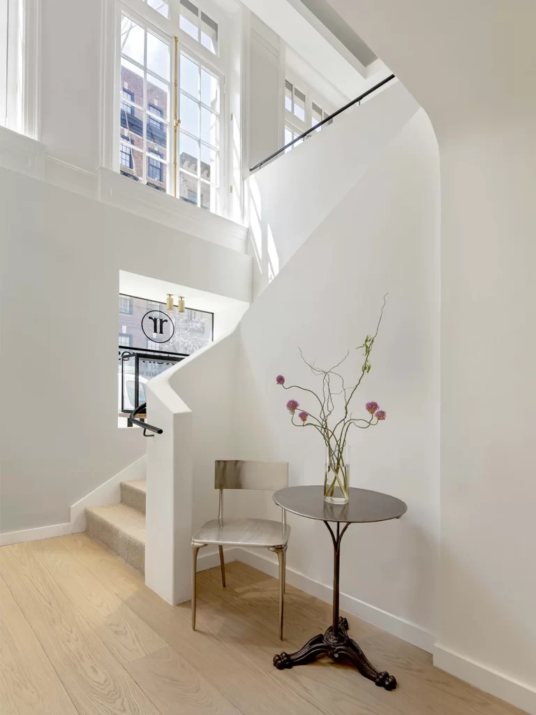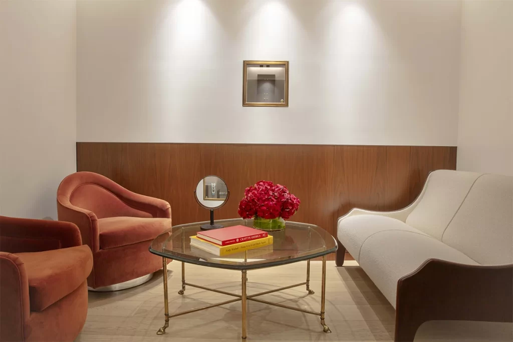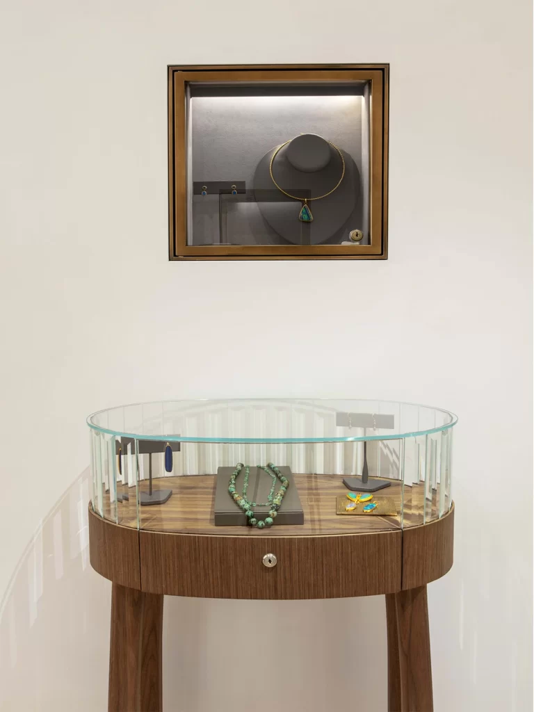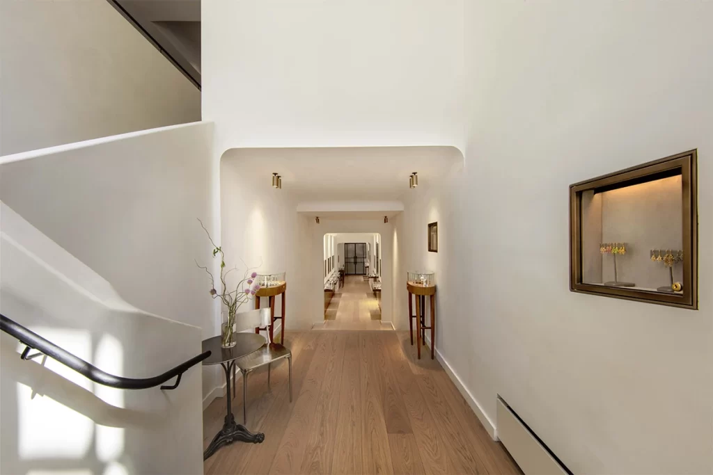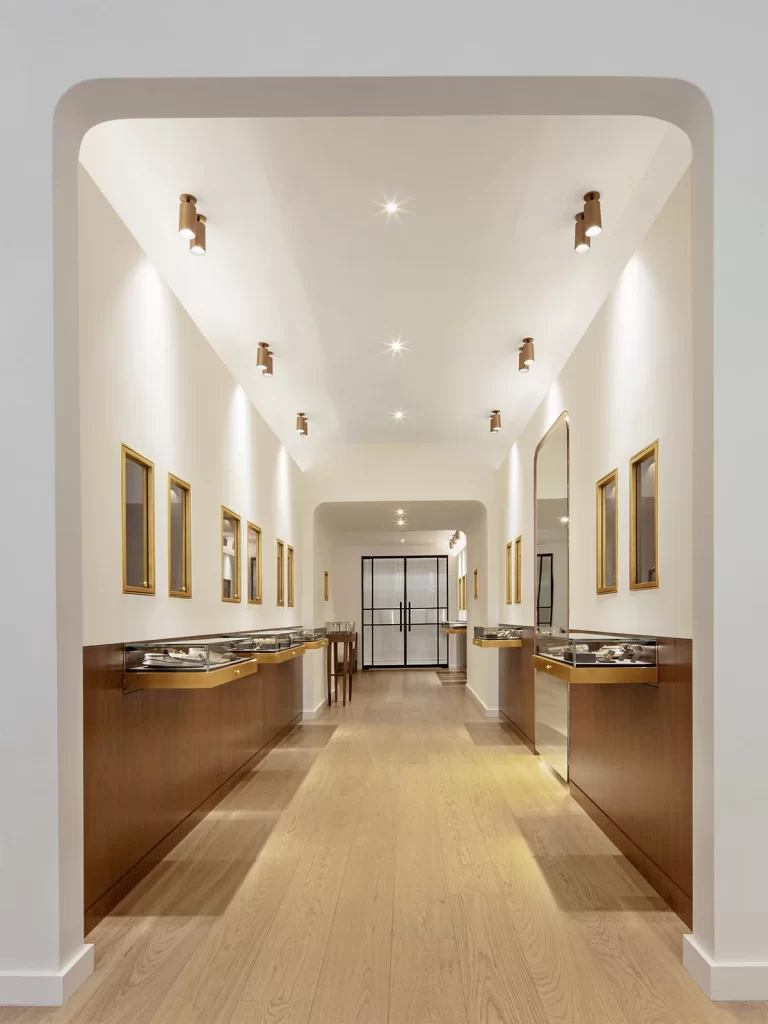 White plank oak floors, lime washed walls and walnut paneling span the first floor, where clients experience the chic and timeless jewelry across three sequential retail spaces, surrounded by custom vitrines and display cases. On the second floor, sales associates welcome customers in a living room, offering a behind-the-scenes look into the studio where Reinstein Ross’s DNA continues to reflect the old world of jewelry making with a modern attitude.
